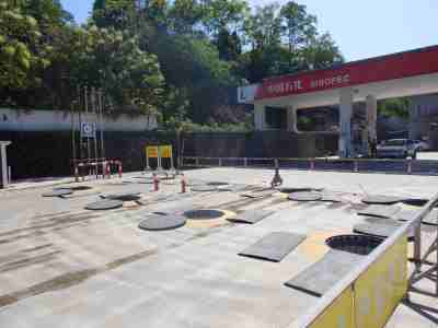 加油區(qū)設置加油罩棚,罩棚為混凝土框架結構罩棚。罩棚下設置4臺雙油品雙槍自吸式加油機(汽油加油槍帶油氣回收);埋地油罐區(qū)設有4只30m³埋地臥式單層鋼制油罐(油罐均為車道罐,設置在承重防滲罐池內),其中2只30m³汽油罐(分別儲存92#汽油和95#汽油),2只30m³柴油罐(儲存0#柴油),折合油罐總容積為90m³(柴油罐容積折半計入),根據(jù)《汽車加油加氣加氫站技術標準》GB50156-2021的相關規(guī)定,該加油站為三級加油站。
